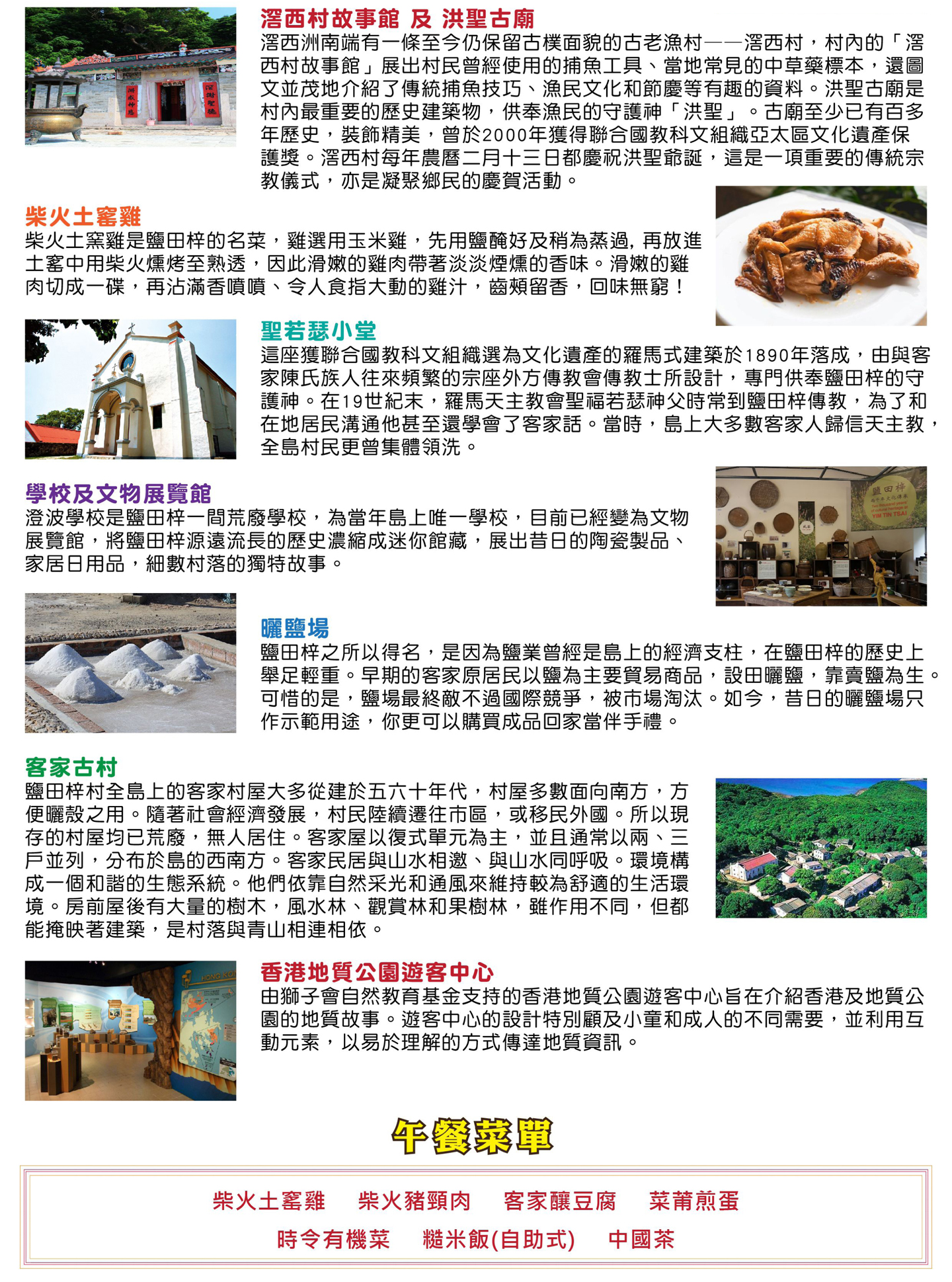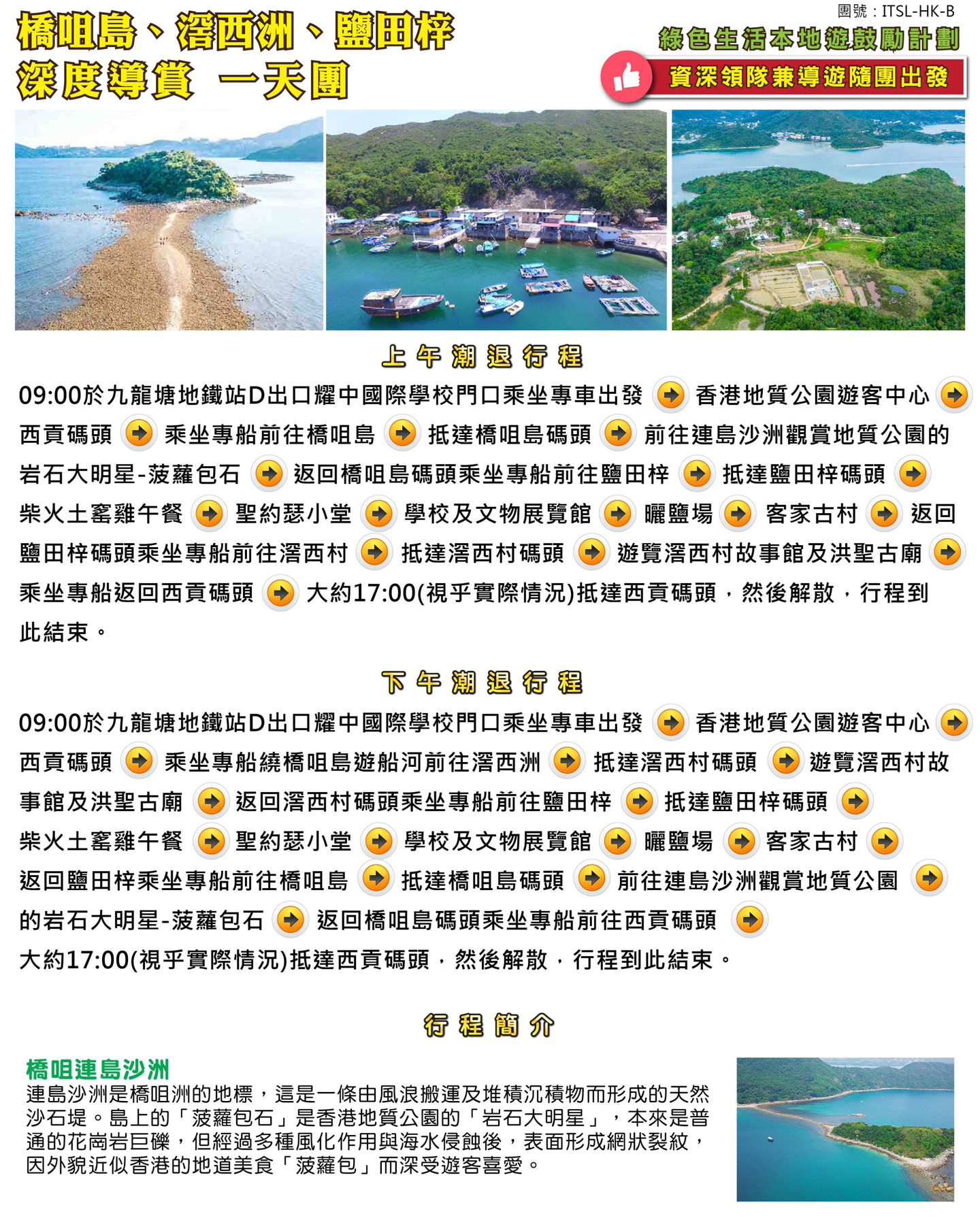 09:00於九龍塘地鐵站D出口耀中國際學校門口乘坐旅遊巴士出發 → 香港地質公園遊客中心 → 西貢碼頭 → (上午退潮:橋咀島連島沙洲賞菠蘿包石 → 鹽田梓 → 滘西村 ; 下午退潮:滘西村 → 鹽田梓 → 橋咀島連島沙洲賞菠蘿包石) → 乘坐專船返回西貢碼頭 → 大約17:00(視乎實際情況)抵達西貢碼頭,然後解散