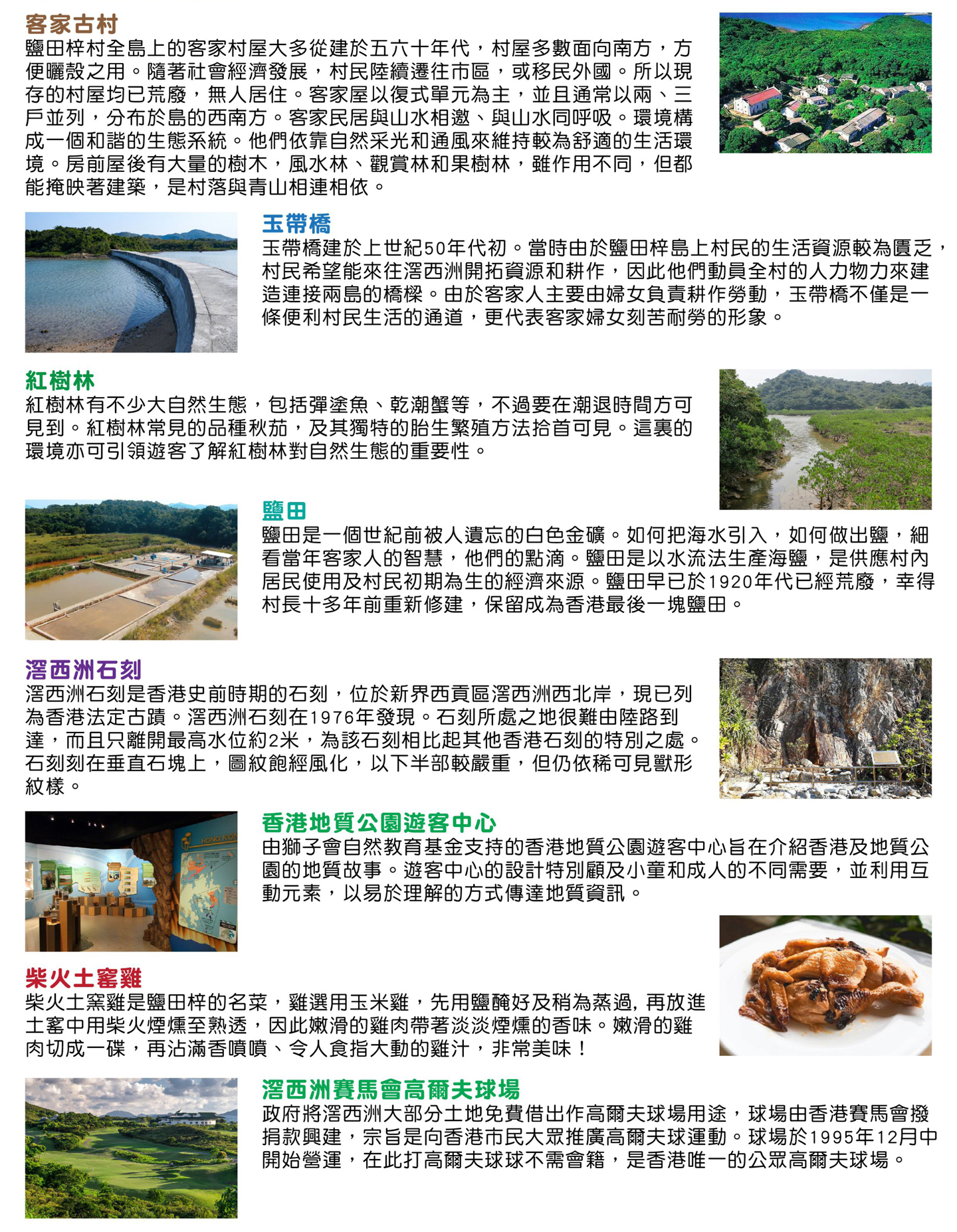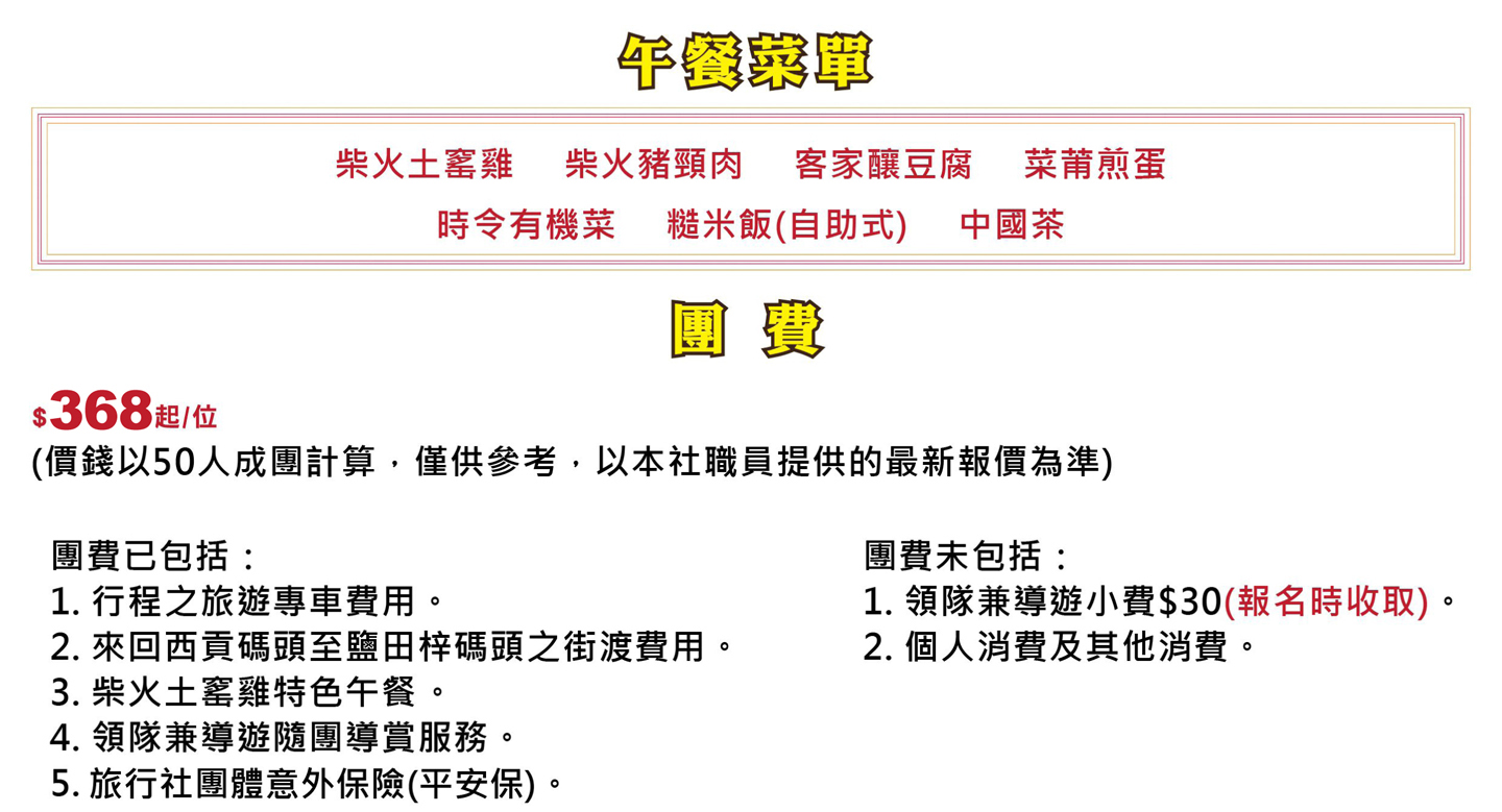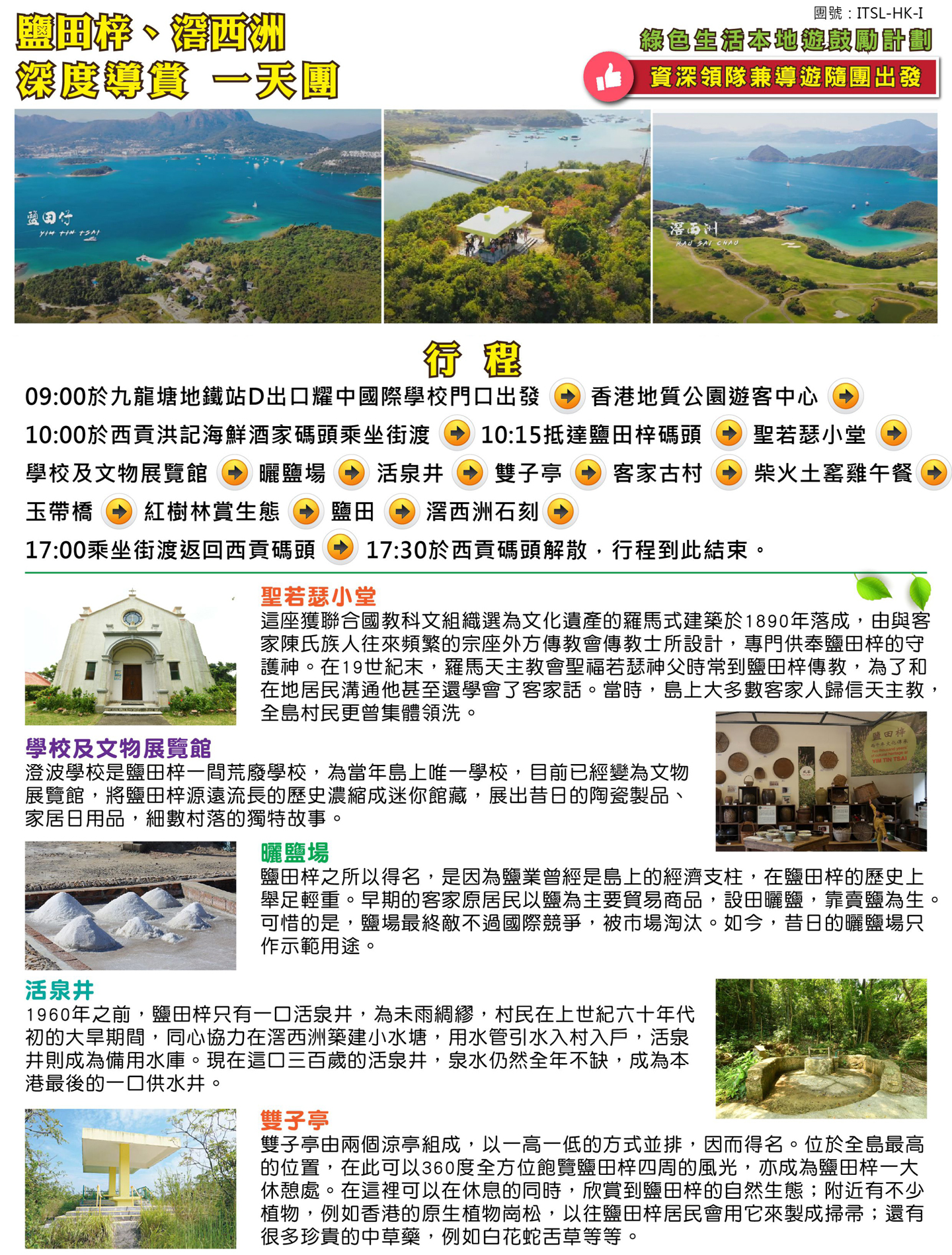 09:00於九龍塘地鐵站D出口耀中國際學校門口出發 → 香港地質公園遊客中心 → 10:00於西貢碼頭乘坐街渡 → 10:15抵達鹽田梓碼頭 → 聖若瑟小堂 → 學校及文物展覽館 → 曬鹽場 → 活泉井 → 雙子亭 → 客家古村 → 柴火土窰雞午餐 → 玉帶橋 → 紅樹林賞生態 → 鹽田 → 滘西洲石刻 → 17:00乘坐街渡返回西貢碼頭 → 17:30於西貢碼頭解散,行程到此結束