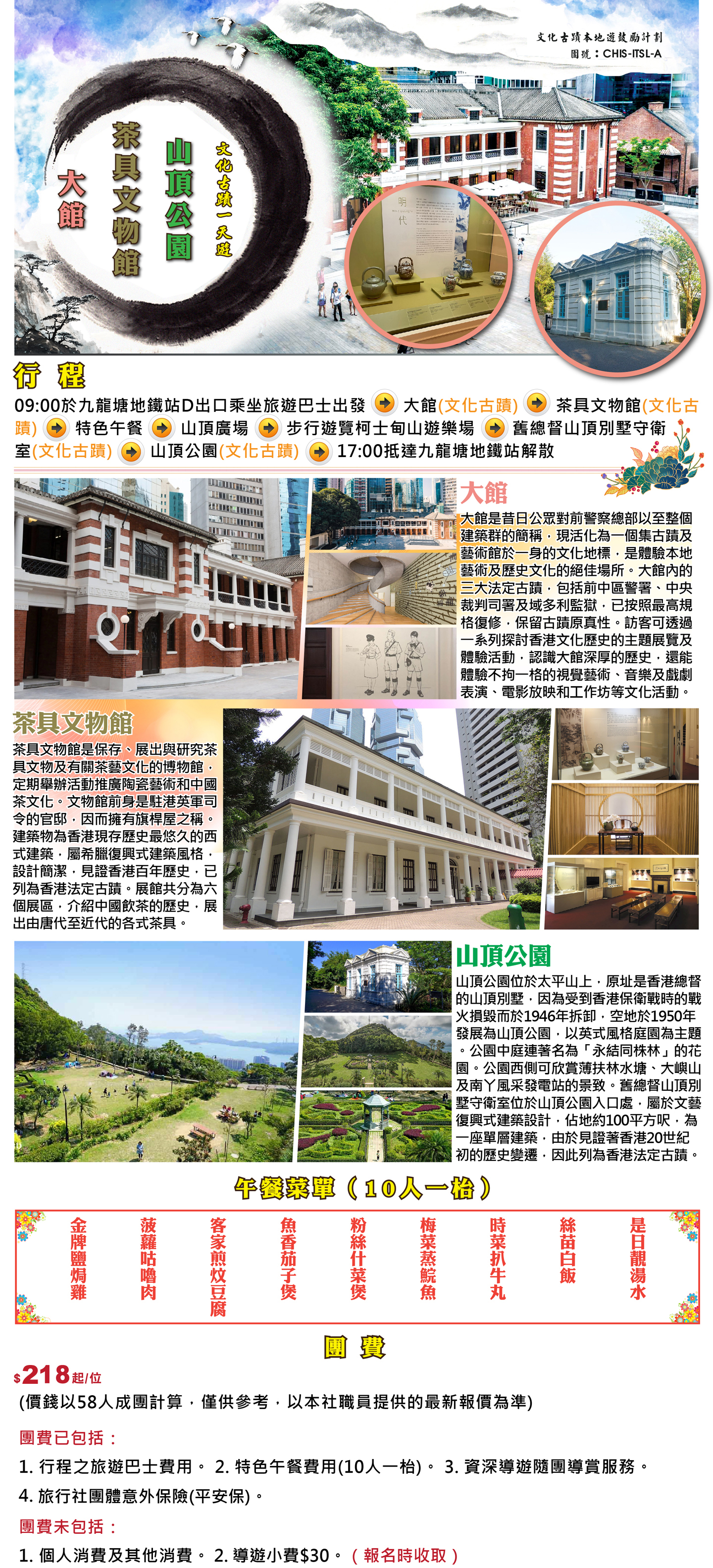 09:00於九龍塘地鐵站D出口乘坐旅遊巴士出發 → 大館(文化古蹟) → 茶具文物館(文化古蹟) → 特色午餐 → 山頂廣場 → 步行遊覽柯士甸山遊樂場 → 舊總督山頂別墅守衛室(文化古蹟) → 山頂公園(文化古蹟) → 17:00抵達九龍塘地鐵站解散