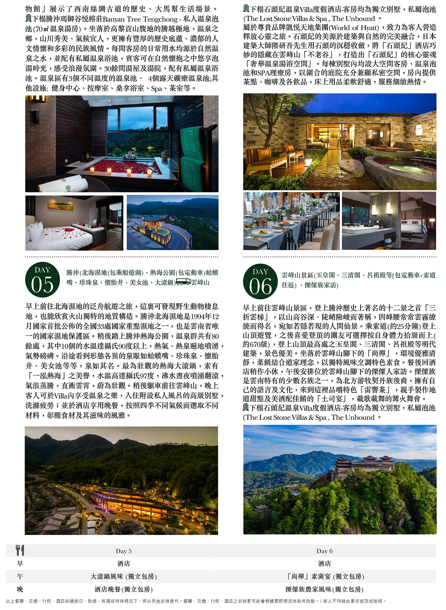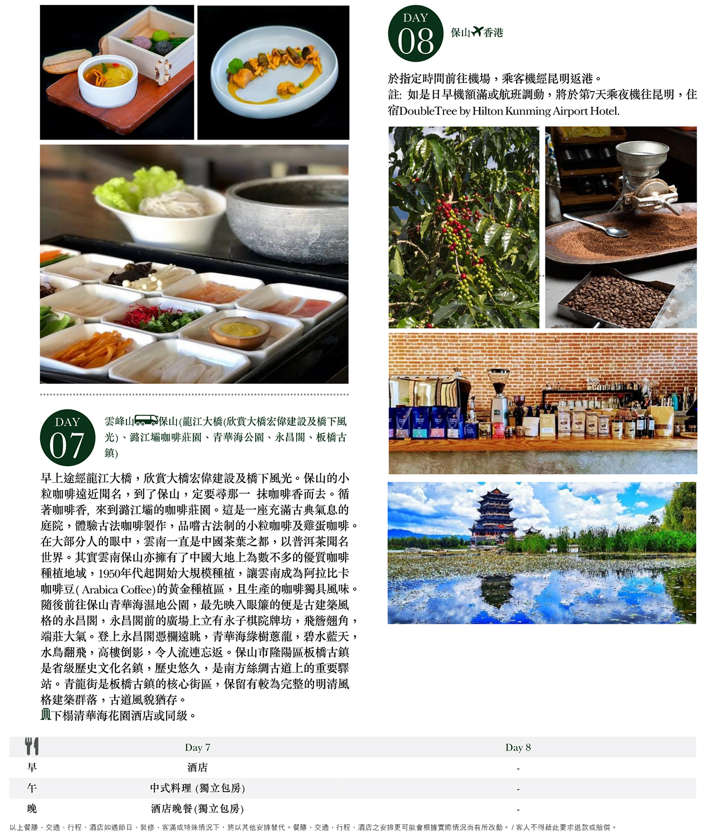5. 膳食-在不損害「本公司」及其他代理人在發生突發或無法預料事件情況下有權替換行程內之項目下,顧客將獲安排旅程表內所列或同類食肆。
