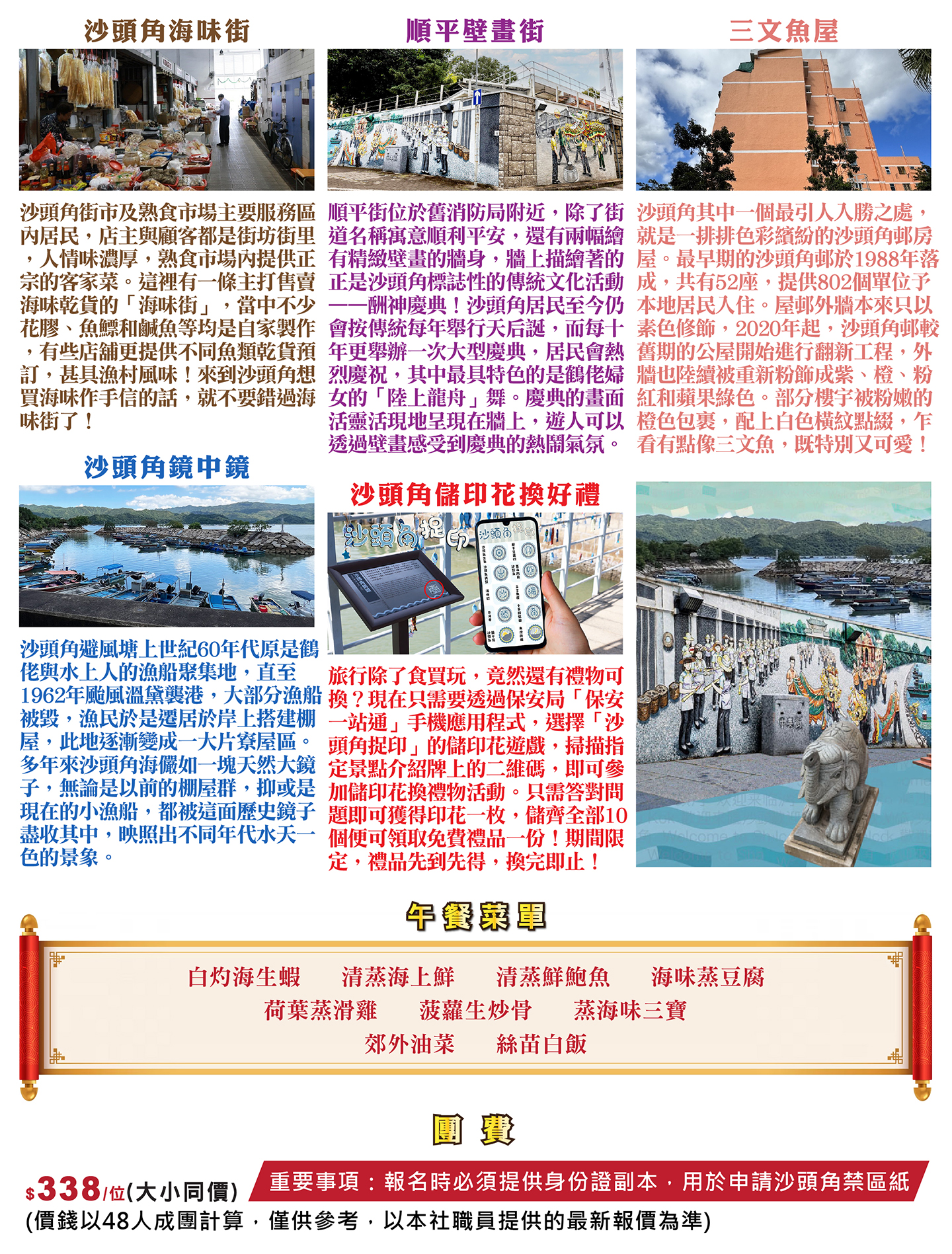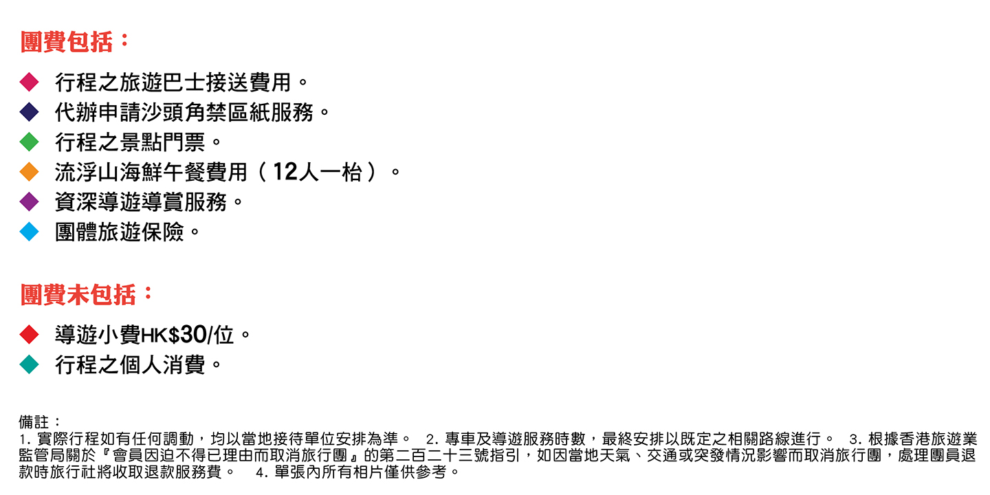 - 由於部份行程景點路面不平,需步行或走上多級階梯,故不建議孕婦或行動不便的人仕參加。