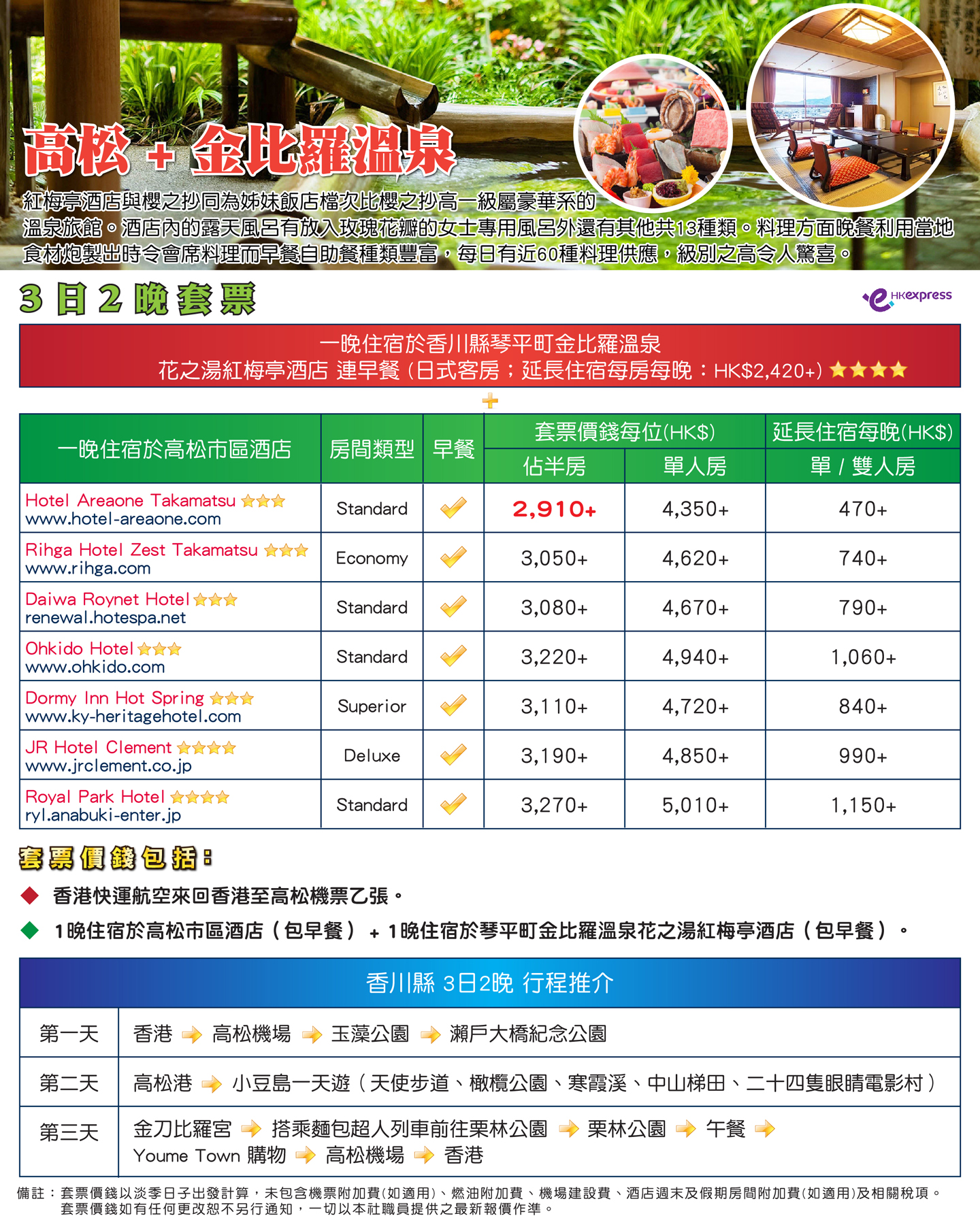 香川縣「金比羅溫泉.花之湯紅梅亭酒店」溫泉套票